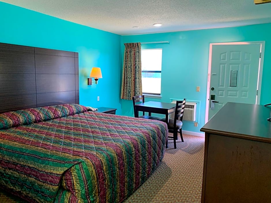 This spacious room features a small seating area, microwave, and small refrigerator.